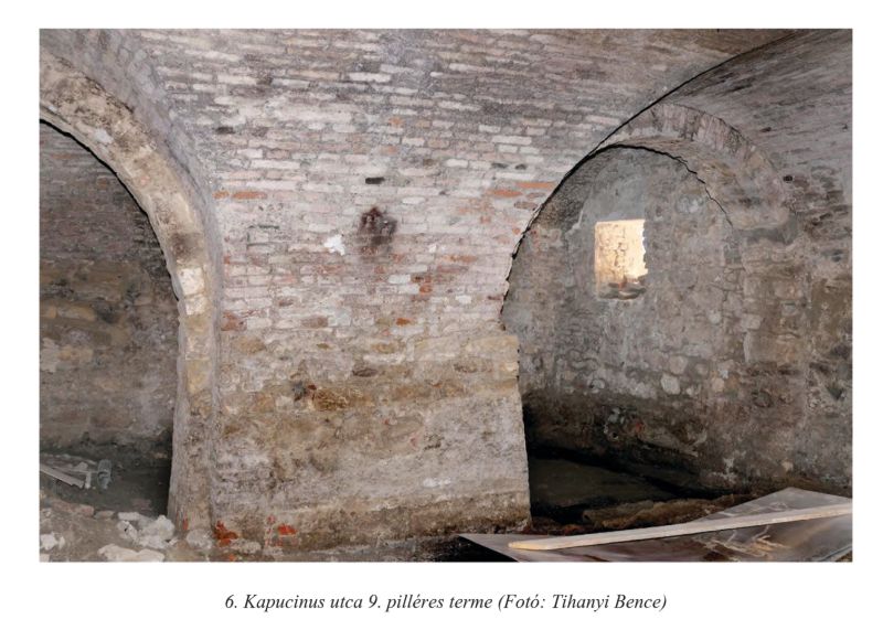 A Kapucinus utca 9. számú épület elődje a 14. században épült, majd a 15. században jelentősen átépítették. Ennek legfontosabb helyisége a nagyméretű, 8 × 8,5 méteres belső terű, boltozott, középpilléres „pince” volt. Fölötte három szoba és egy ülőfülkés kapualj állt, azon keresztül lehetett behajtani az udvarra. Lehetséges, hogy az épület többször is fogadóként és italmérésként működött a 15–18. században.