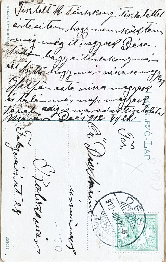 „Tisztelt k. ténsasszony, tisztelettel értesítem, hogy nem küldtem még, még itt vagyok Désen. Tudom, hogy a ténsasszony már azt hitte, hogy már visszamegyek. Hétfőn este visszamegyek, és talán másnap megyek tovább, addig is maradok tisztelettel, Mórán, Deés, 912 VI/22.”