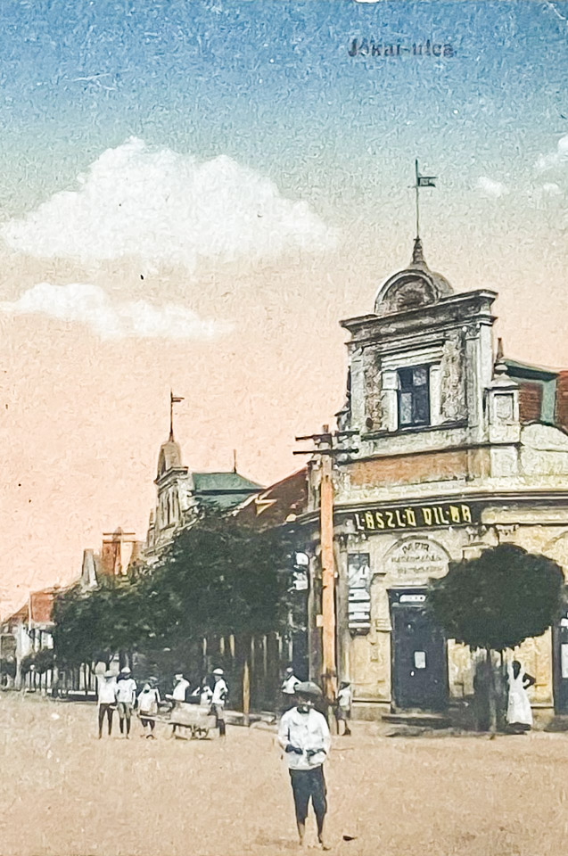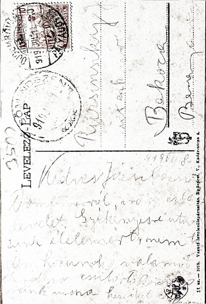 A vasút meghozta a jólétet is, munkásokkal, vállalkozásokkal, például László Vilmának a képen látható könyv- és papírüzletével. Talán éppen itt vásárolta a mai lapunkat a feladója, aki Ruzsinszky J. számára postára adta a Baranya vármegyei Bakócára. A szöveg meglepő voltára magyarázatot ad a dátum, 1919. július 8. Ez már a tanácsköztársaság időszakának legvége, demoralizálódott államigazgatással, kibontakozó zűrzavarral.