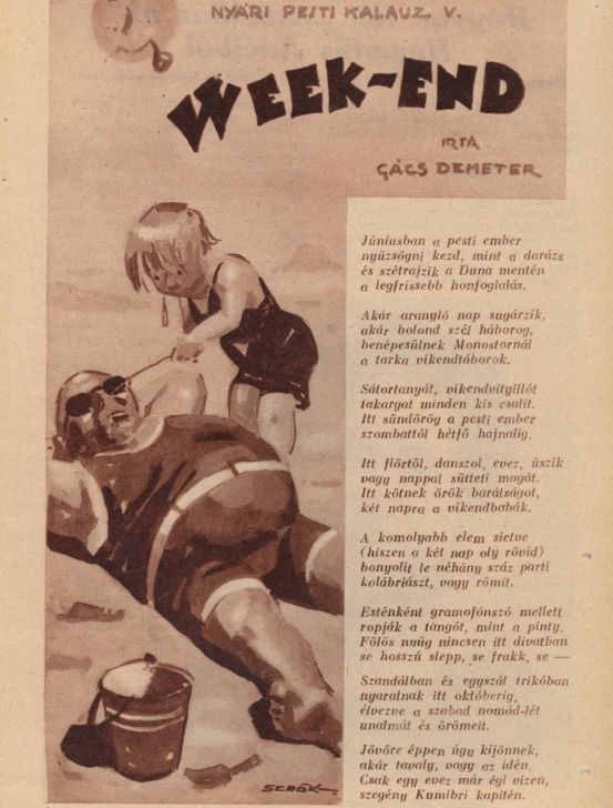 Színvonalában nem vetekedhetett az olyan római-parti csúcshelyekkel, mint a Római Fürdő tóvendéglő, a Lieb étterem vagy a Bürgermeister kerthelyiség, de Kumibri bácsi megkapó személyisége, tréfálkozós természete kárpótolt az esetleges hiányérzetért. Mert a kurta fürdőnadrágos, csokoládébarna bőrű, mindig mosolygó kapiténből tényleg csak egy volt. Ott lapátol most is valahol a nagy víz túlsó partja felé igyekezve.