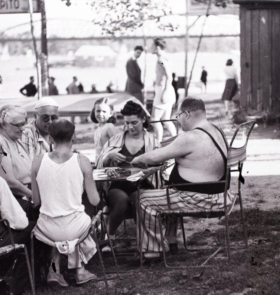 Római part, háttérben a túlparton újpesti gyárak, a cigarettázó szemüveges úr vállánál a Népsziget látható. 1937. Fortepan/Papp Róbert