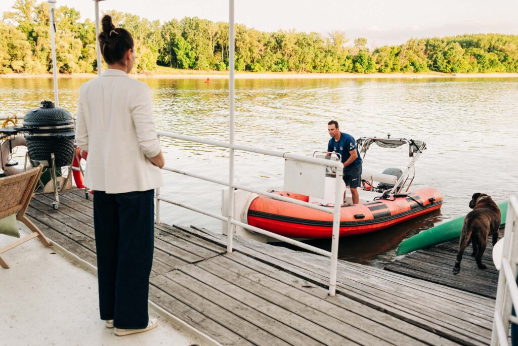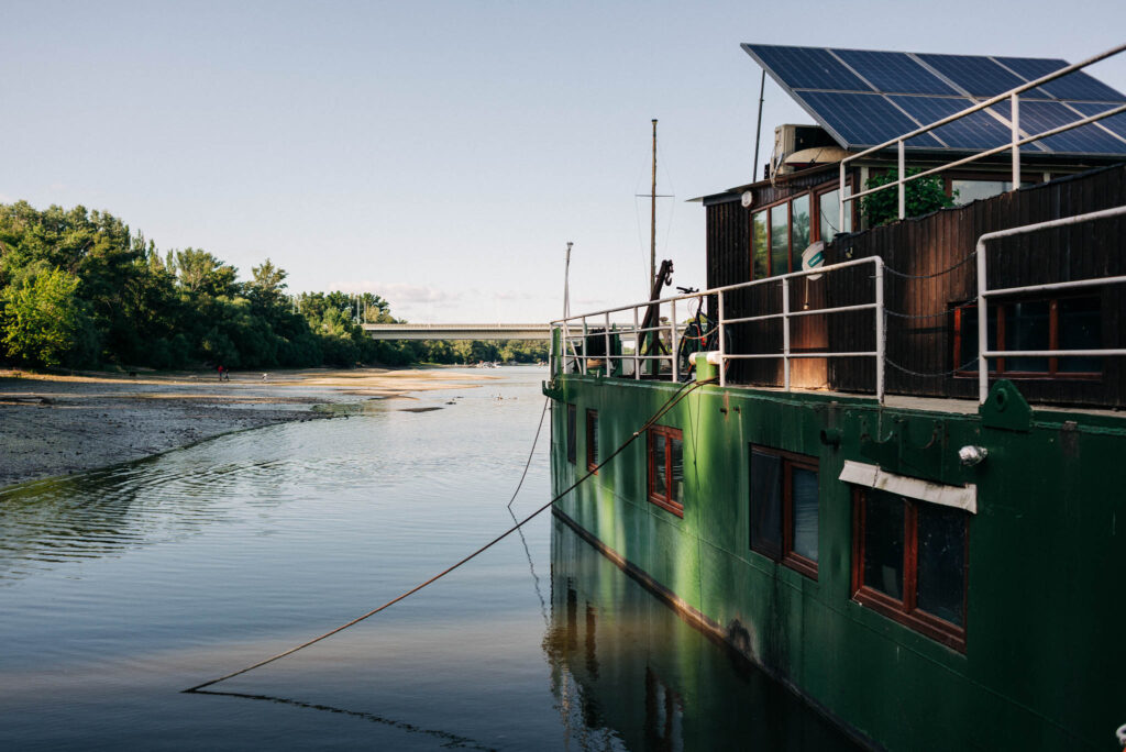 A család eleinte nem tapsolt. „Minden pénzünket a hajóba öltük. Az első évben ki se mertem vinni a szüleimet a váci sóderbányához, ahol az otthonunk épült: egy darabjaira bontott, rozsdás fémszerkezet volt, amit Gyuri ötlete alapján teljesen újraterveztettünk.” Barátokkal, kalákában csinálták a javát, a végén a család is besegített. A 2013-as nagy árvíz idején a hajó már készen állt arra, hogy Vácról leúsztassák első állomáshelyére, az újpesti hajógyár előtti partszakaszra. Beköltöztek a félkész hajóba, de a java csak ezután következett.