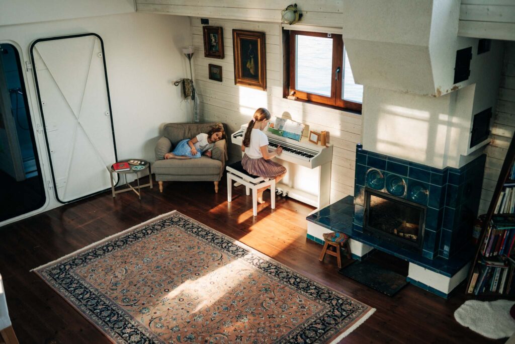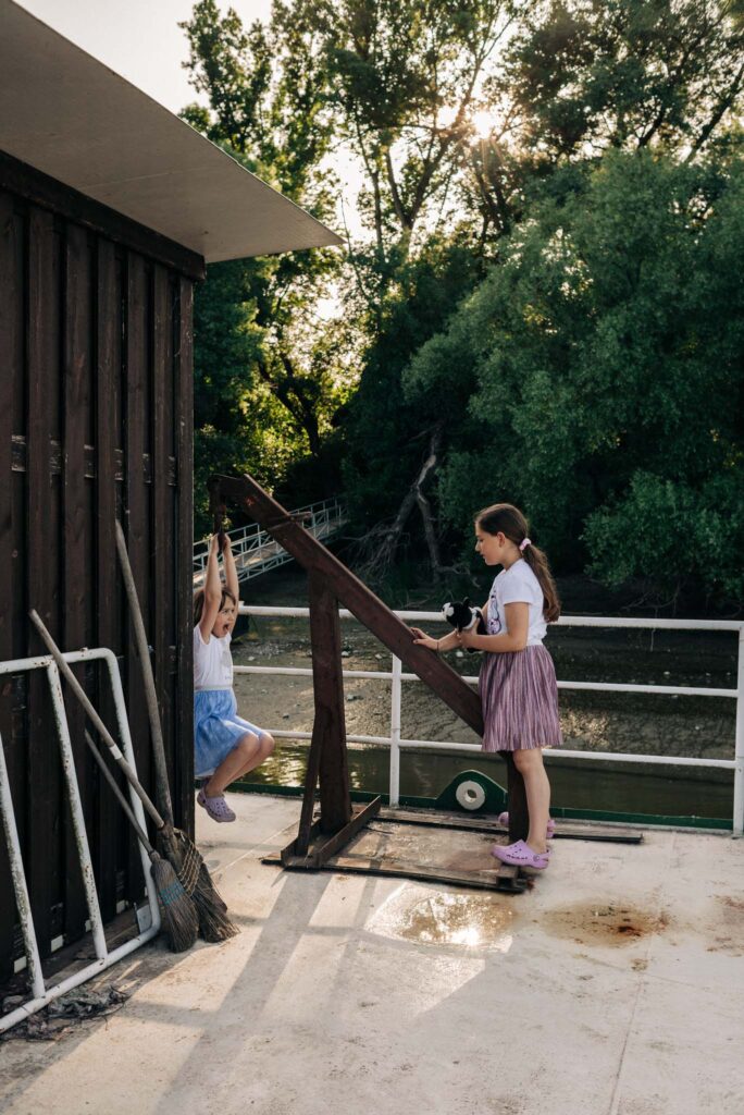 Úgy szaladgál a két lány a dekken, mint más gyerekek a kertben, ha megadatik. Árvaszúnyogot fognak, vizet merítgetnek, körbevezetnek, mintha magától értetődne, hogy az otthonuk egy fatüzelésű kályhával is felszerelt hajó. Ők már ebbe születtek. A folyami életbe és abba, ami ebből következik.