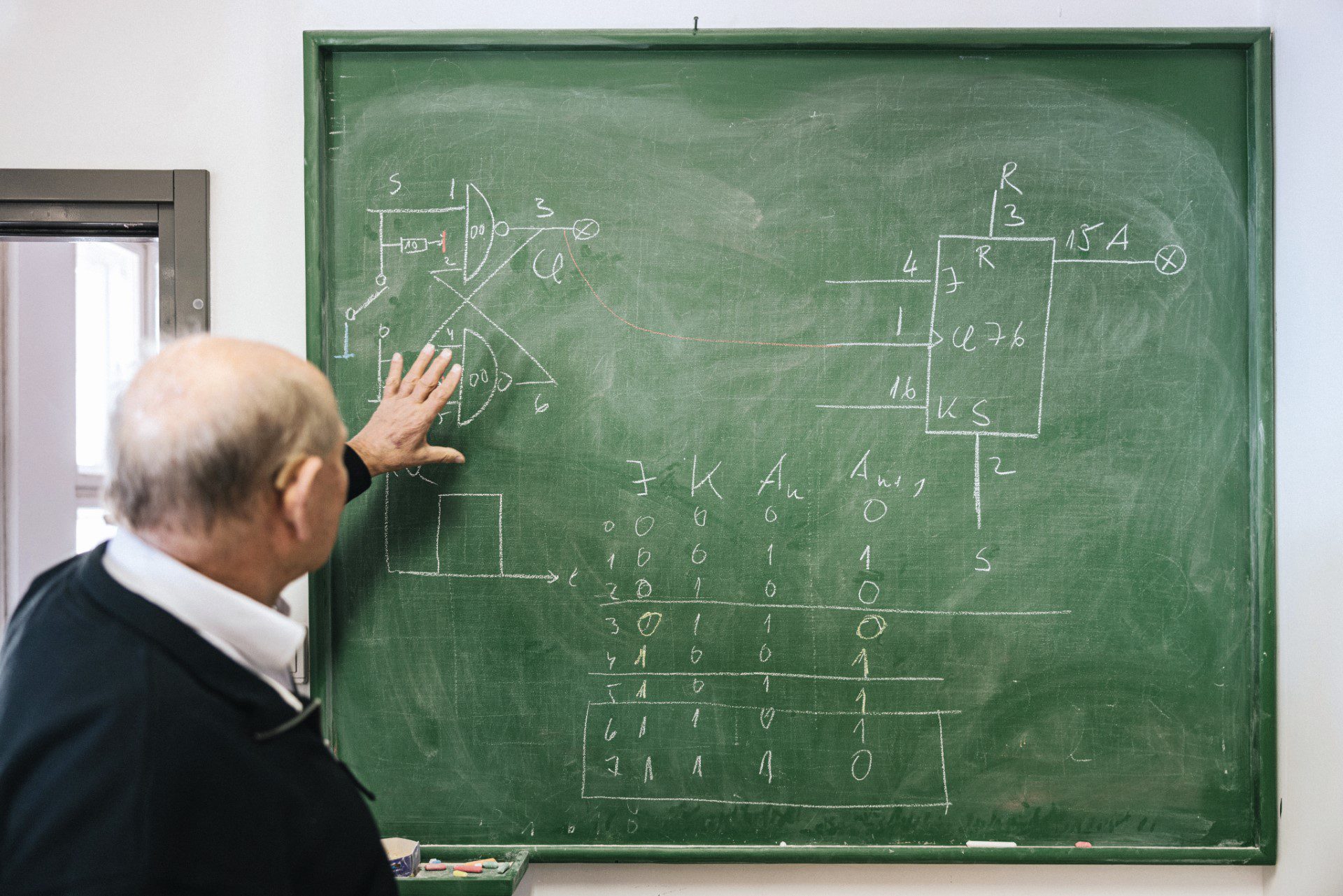 A második osztályommal kezdtem, kényszerből. A hatvanas években, a hatnapos tanítás időszakában bevezették a diákok gyári gyakorlatát, ahol pedig nem volt gyár a közelben, ott az úgynevezett politechnika-órákat. Nekünk itt, Pannonhalmán ez utóbbi jutott, az első osztályom meg nekiállt szépen szombatonként reszelgetni. Rettentően sajnáltam őket e felesleges és teljességgel haszontalan időtöltés miatt, ezért elhatároztam, hogy a következő társaságot már megmentem a hülyeségtől. Elkezdtem tájékozódni, mivel lehetne értelmesen kiváltani a politechnika-órákat. Sikerült beszereznem nyugatról néhány logikai áramkört, és kis laborokat építettem belőlük. Ezzel a felszereléssel indultam el, majd amikor a politechnika-órák hivatalosan is megszűntek, szakkörré alakítottam az egészet. Amit materiális értelemben is én tartok fenn a kezdetektől, az iskolának ebben egy fillérje sincs. Az öregdiákjaim szoktak segíteni, a falon lévő nagy lcd-monitor például az említett második osztályom közös ajándéka. De nemcsak ezért van nagy szabadságom, hanem mert itt azt tanítok, amit akarok, amit jónak, a gyerek számára hasznosnak tartok. Itt a tanítás a szó legjobb értelmében korszerű.