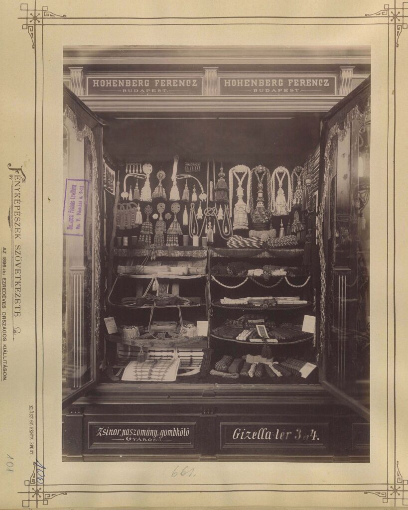 Paszomány és gombkötőgyáros vitrinje az 1896. évi millenniumi kiállításon, forrás: Fortepan