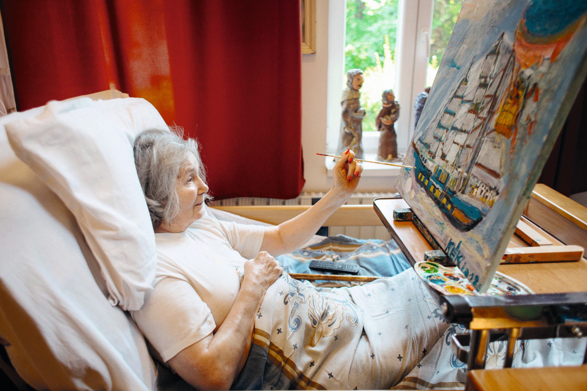 „A pápa nagyon jópofa ember volt” – mutat rá oklevelére Kajibás Éva már a Sarepta Budai Evangélikus Szeretetotthon szobájában. Az életet ízig-vérig megélő, minden helyzetben helytálló alkotó- és tanárnő színekkel tölti meg a körülötte lévő falakat. Mióta észrevette, hogy nehezen mozgatja ujját, húsz év telt el, a szklerózis multiplex mára az egész testét megtámadta. Lassan, nehezen beszél, leginkább ecsetvonásaival kommunikál. Közelben lakó fia segíti, hetente többször látogatja, mesél, felépíti az állványt, hozza a festékeket, ecseteket. Azt mondja, sokszor belekezdenek egy történetbe, és egy-két óra múlva képben ölt formát az, amit édesanyja szeretett volna elmondani. Most kell csak igazán a csodából merített erő.