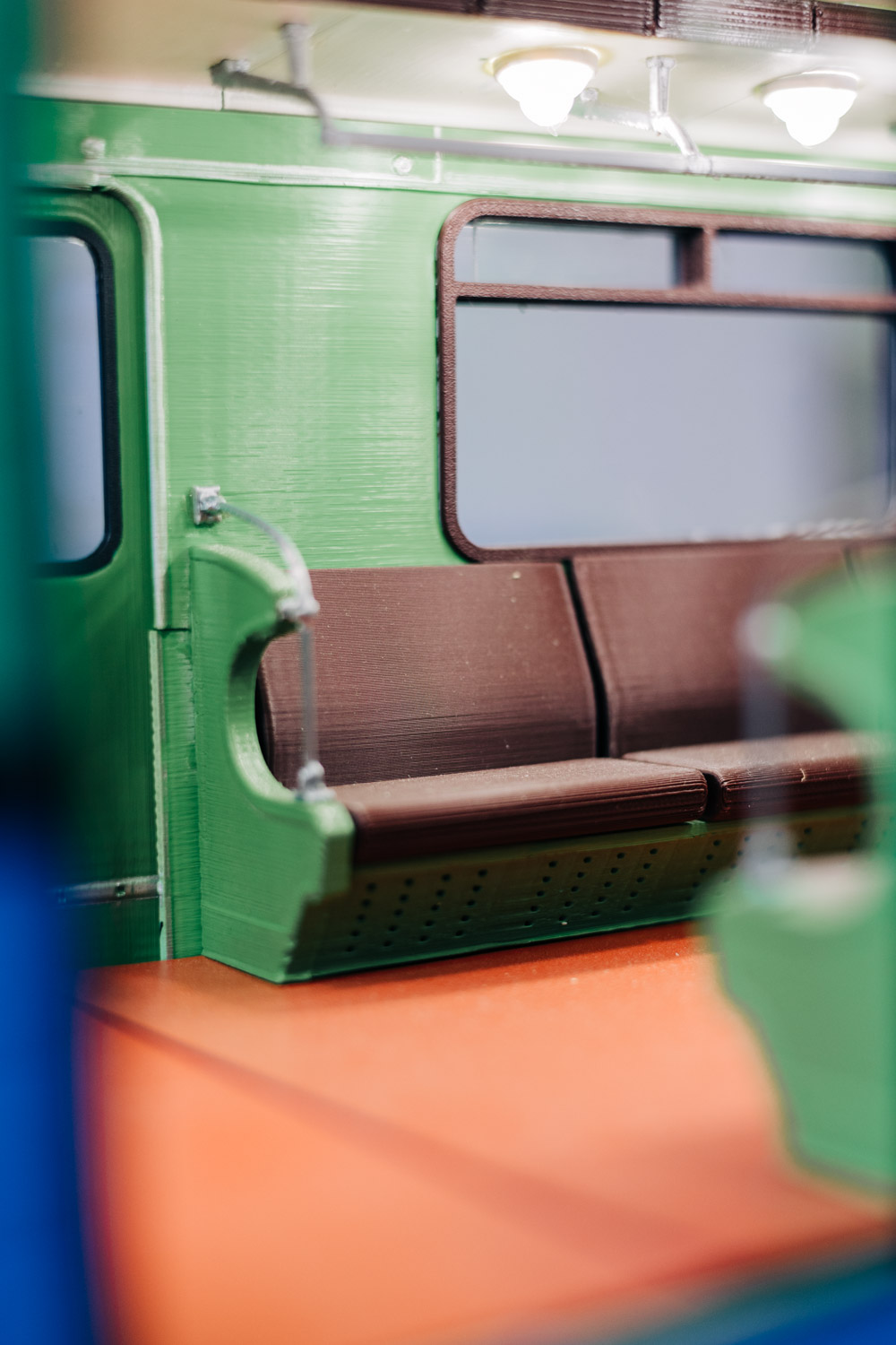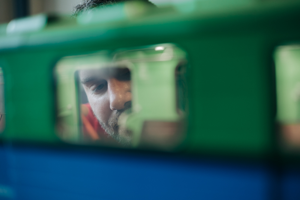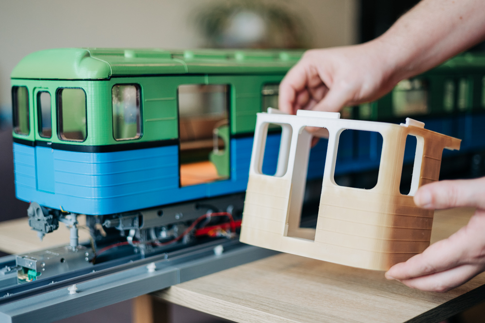 „Itt van ez a laprugó – mutat Dávid egy kicsi, lapos részre –, ebből van elöl is, hátul is, és mindkét oldalt, és mindkét forgóvázon. Tehát külön meg kellett tervezni és elnevezni kategóriánként katalogizálva, hogy »A« forgóváz első jobboldali, és így tovább. Egy ilyen elem kinyomtatása három perc. De vannak nagyobb elemek, például egy kocsi vége, azt tizenhárom órán át nyomtatja a gép. Az összes alkatrész nyomtatása hat-hétszáz órát vesz igénybe. Utána jön a festés, az összeállítás.”