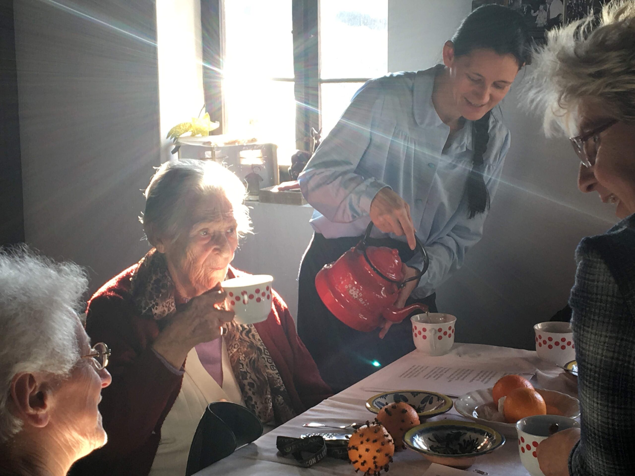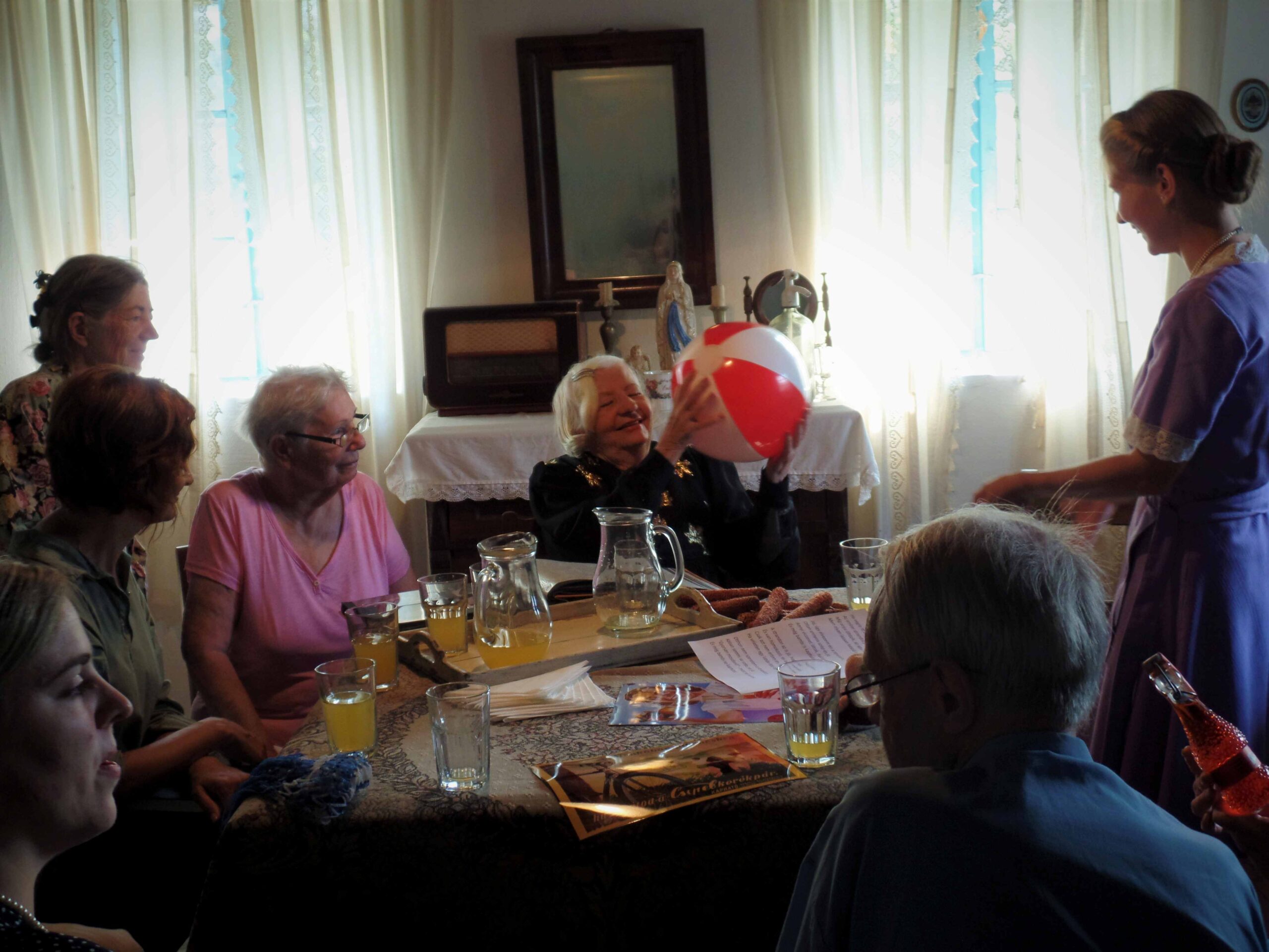 A közös koccintás egyben szimbolikus gesztus is: azt fejezi ki, hogy a foglalkozást vendégségként értelmezzük. Ebből a helyzetből természetes beszélgetés bontakozik ki: a résztvevők reagálnak az enteriőrre, felismerik a tárgyakat, és gyakran személyes emlékeket idéznek fel – például hogy hasonló tárgyak vették körül őket gyermekkorukban. A közös italfogyasztás így spontán beszélgetést indít el.